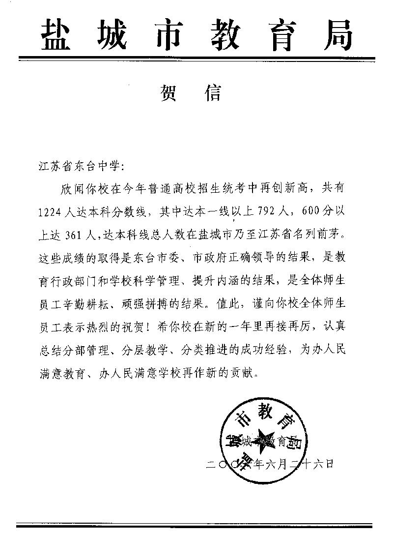 鹽城市教育局賀信