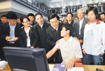 5月3日,在北京大學建校110周年之際,中共中央總書記、國家主席胡錦濤來到北京大學考察。這是胡錦濤在學校圖書館了解學生上網檢索資料的情況。
