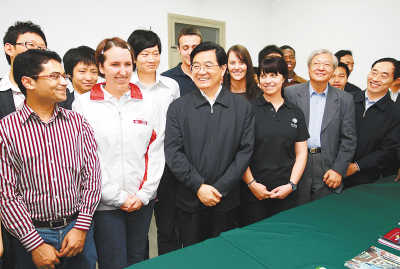 5月3日,在北京大學建校110周年之際,中共中央總書記、國家主席胡錦濤來到北京大學考察。圖為胡錦濤在學生宿舍樓同部分外國留學生親切交談。