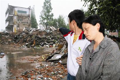 吳老師的妻子宋代群在得知丈夫的噩耗后,極度悲痛說不出話來。昨晚,她在兒子吳楠的攙扶下,從臨時搭建的帳篷里走出來與記者見面。失去丈夫的她,面容憔悴,始終啜泣著。吳楠也站在一旁默默地流著淚。站在廢墟前,母子倆無法掩飾內心的悲痛,望著吳老師遇難的廢墟失聲痛哭?!鞍职忠恢毕M铱家凰玫拇髮W……”正在讀高二的吳楠哭著說,“以后我要加倍努力,不辜負爸爸的希望!”據學校一位老師稱,宋代群是一名下崗工人,患病多年,吳楠在懷遠中學念高二,記者了解到,吳忠紅老師今年45歲,已在教學戰線工作了28年。 (記者李逢春 王迪 見習記者江英 實習生汪龍華 攝影陳羽嘯)