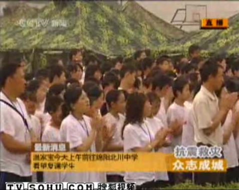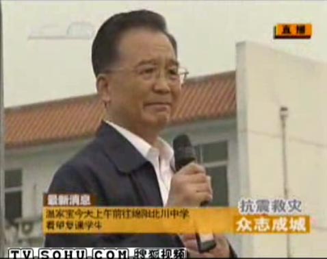 主持人:剛才我們看到的這段畫面是溫家寶總理再次飛赴四川災區指導抗震救災工作,他今天來到了綿陽的郊區北川中學復課的地方,孩子們在上課,復課對于孩子們來說,他們進入了正常的學習生活,溫家寶對全體的師生發表了一篇情真意切的講話。