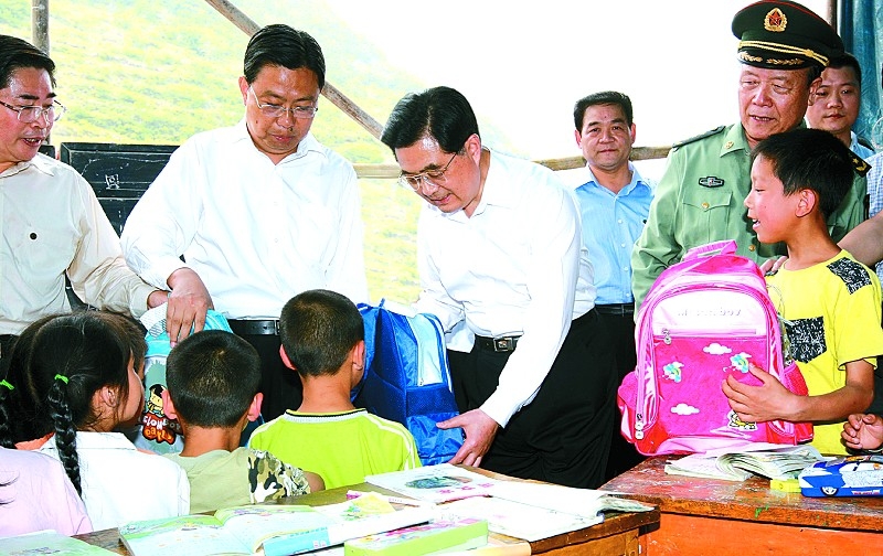 昨日,中共中央總書記、國家主席、中央軍委主席胡錦濤在陜西考察抗震救災和恢復重建工作。這是胡錦濤到寧強縣廣坪鎮金山寺村一個簡易防震棚,向災區少年兒童祝賀節日并贈送學習用品。(新華社發)