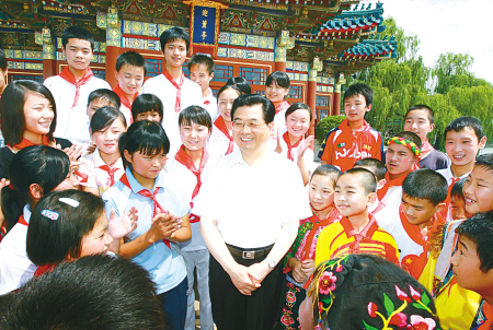 波光瀲滟,微風(fēng)拂面。10時30分許,胡錦濤總書記從辦公的地方步行走到瀛臺,看望正在這里參觀的孩子們。