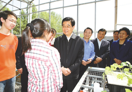 明亮寬敞的溫室里,一盆盆種苗長勢喜人。學(xué)生們在老師帶領(lǐng)下,正進行測土配方施肥等實驗。胡錦濤饒有興趣地觀看,不時詢問有關(guān)情況。