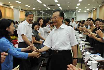 在先后聽?。肝唤處煷戆l言后,溫家寶指出,百年大計,教育為本;教育大計,教師為本。我國有1600萬教育工作者,有1200萬中小學教師。長期以來,廣大教師牢記自己的神圣使命,兢兢業業,默默耕耘,培養了一批又一批優秀人才,為我國教育事業和現代化建設做出了突出貢獻。