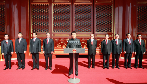 胡錦濤主席檢閱受閱部隊(duì)后,在天安門城樓上發(fā)表講話。江澤民、吳邦國(guó)、溫家寶、賈慶林、李長(zhǎng)春、習(xí)近平、李克強(qiáng)、賀國(guó)強(qiáng)、周永康出席大會(huì)。新華社記者 鞠鵬 攝