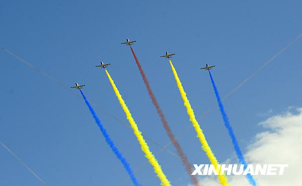 鷹擊長(zhǎng)空,劍嘯蒼穹。11時(shí)11分,由陸、海、空三軍航空兵151架戰(zhàn)鷹編成的12個(gè)空中梯隊(duì)呼嘯凌空。預(yù)警機(jī)、加受油機(jī)聯(lián)袂亮相,殲—10、殲—11三代戰(zhàn)機(jī)比翼齊飛,轟炸機(jī)、殲轟機(jī)、殲擊機(jī)壯志凌云,武裝直升機(jī)、偵察直升機(jī)氣貫長(zhǎng)虹。11時(shí)20分,隨著我國(guó)培養(yǎng)的首批戰(zhàn)斗機(jī)女飛行員駕駛高級(jí)教練機(jī)在天安門上空拉出道道彩色煙帶,氣勢(shì)磅礴的國(guó)慶60周年閱兵圓滿結(jié)束。