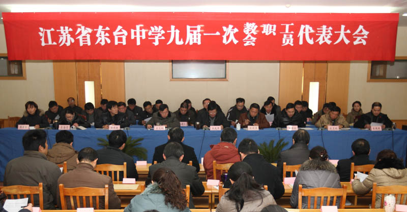 兩時許,《國歌》聲響起,大會正式開始。在謝謙云同志致開幕詞,陳小勇部長致辭后,王兆平同志作了題為《凝心聚力,攻堅克難,為學校穩定、持續發展而努力奮斗》的學校工作報告。他總結回顧了八屆一次教職工代表大會以來,學校四年的改革和發展經驗,研究部署了今后三年的工作目標和任務。他指出,東中的發展進入了一個新的歷史時期。責任要求我們要面向未來,在發展目標上重新定位;使命要求我們要解放思想,在內涵發展上爭先進位。面對困難和挑戰,我們只有凝心聚力,發揮聰明才智,乘勢而上。東中的發展,需要大家和衷共濟;東中的崛起,期待同志們風雨兼程!我們要充分用好促進學校發展的有利條件和積極因素,又要充分正視面臨的困難和制約的“瓶頸”。切實增強憂患意識,把難度想得大一點,把困難估計得多一點,把思想準備和應對措施考慮得更充分一點。堅定信心不動搖,創新求變不停步,遠謀近施不懈怠。努力在新的起點上,繼續發揚 “永不言棄 永無止境”的東中精神,堅定信心,鼓足干勁,實現東臺中學的穩定、持續科學發展!