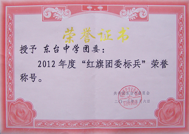 近日,東臺團市委下發表彰決定,江蘇省東臺中學團委被評為“2012年度東臺市紅旗團委標兵。