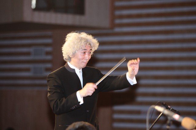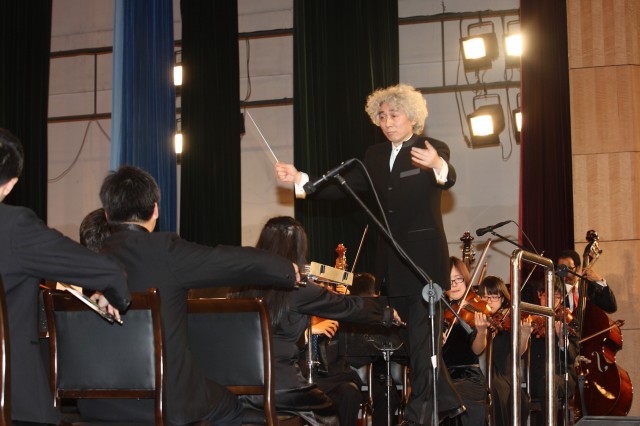 呂曉一現任中國指揮學會會員、南京大學副教授、南京大學交響樂團、香港青年愛樂樂團音樂總監、常任指揮,是江蘇省東臺中學校友。演出中,他那細膩流暢的指揮技術和簡潔明快、富于歌唱性的指揮風格讓人贊不絕口,幽默風趣的解說又讓大家笑聲不絕。而為他的學弟學妹們講解弦樂、木管、銅管、打擊樂等四組交響樂器知識,讓呂曉一感到很是欣慰。他用地道的東臺話對同學們說:“我是從東中校園走出去的,我的中學老師中有好幾位依然在東中校園辛勤耕耘.”他多次重復著:“要成功,上東中。”六時許,音樂會在《拉德斯基進行曲》歡快的旋律中徐徐落幕,大家意猶未盡,合著樂曲的節拍,臺上臺下長時間互動,掌聲響徹整個禮堂,掌聲中深含著不舍之情。
