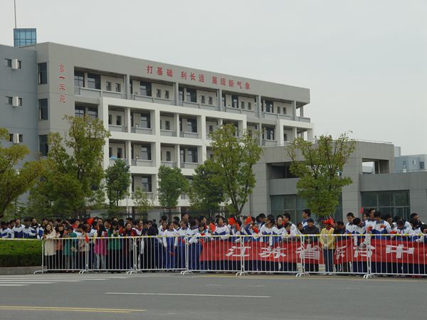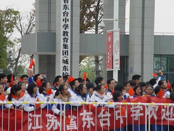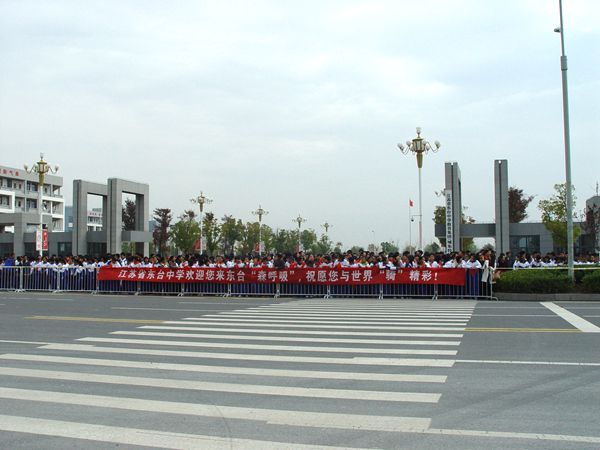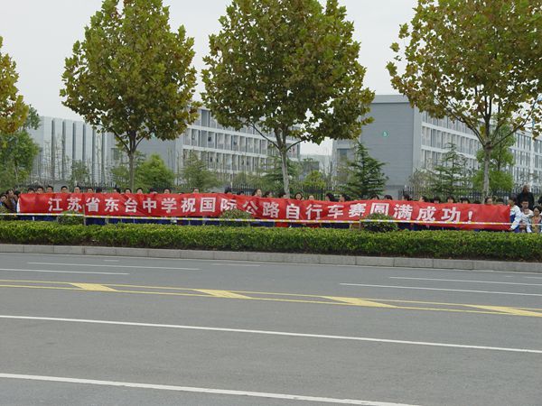 上午九時半考試結束,學生稍事休息后,各年級同步有序組織各班快速集合,在事先確定好的觀看區域提前定位。現場師生打出“江蘇省東臺中學為您加油!”、“江蘇省東臺中學祝國際公路自行車賽圓滿成功!”、“江蘇省東臺中學歡迎您來東臺‘森’呼吸,祝愿您與世界‘騎’精彩!”等橫幅標語。等待中,各班不時高呼“中國,加油!”、“東中,加油!”、“東中歡迎您!”同學們揮舞國旗和彩棒,歡呼聲此起彼伏,令人激動。