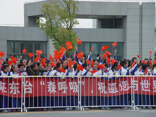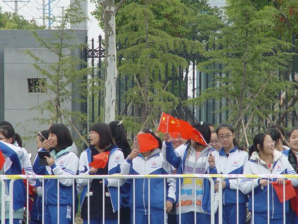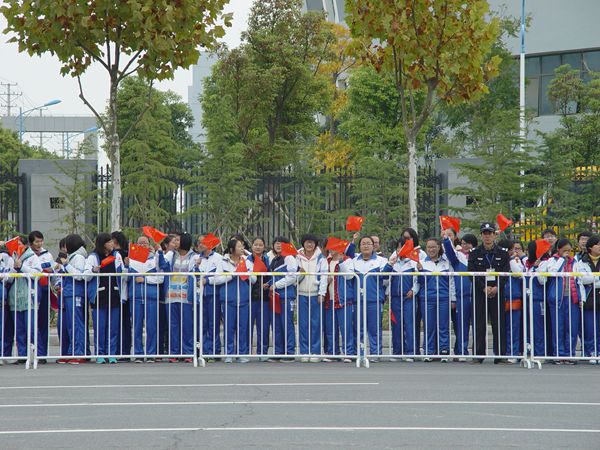 當車隊從學校東南角惠陽路拐彎處賽道剛剛出現,師生情緒沸騰了!他們振臂呼喊“加油、加油!”、“中國,加油!”迎面而來的不少車手,露出了會意的微笑。在熱烈的歡呼聲和掌聲中,車隊像一股旋風,疾速騎過學校路段。同學們紛紛露出驚訝的表情,頻頻高喊“太快了!太帥了!”目睹倏忽離去的車隊,意猶未盡。