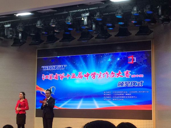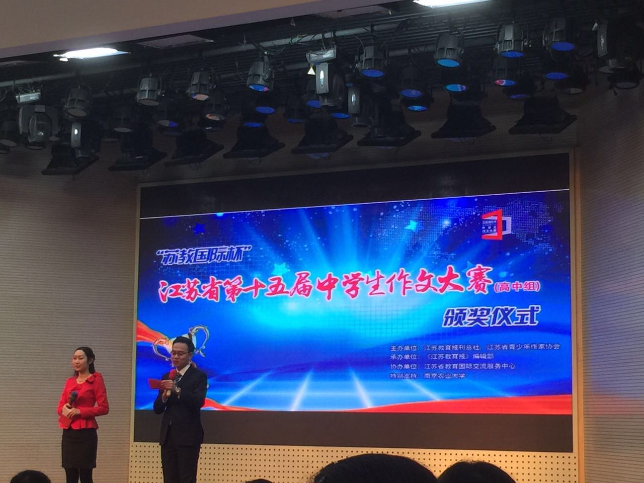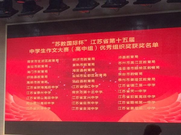 “蘇教國際杯”作文大賽是經過江蘇省教育廳批準的重要作文大賽,由江蘇教育報刊總社主辦,在全省有重要影響。本次大賽由省教育廳副巡視員孫曙平任組委會主任,組委會成員有省教育廳辦公室主任王魯沛、省教育廳基礎教育處處長馬斌、江蘇教育報刊總社社長孫其華、江蘇省教育國際交流服務中心主任賀興初、江蘇教育報刊總社總編輯曹連觀等。今年“蘇教國際杯”從全省近20萬名同學中遴選出260名選手參加現場決賽,選手在《生活在別處》和《觸摸一個詞語》兩個題目中任選一題展開激烈角逐。最終,經過專家評委的初評、復評、終評,我校高一(1)班儲小磊同學、高二(2)班崔雨珩同學榮獲一等獎。另有16名同學分獲初賽二、三等獎。徐長進、朱曉紅、馬亞峰、周江、孫麗華、鄒恒清等六位老師獲得優秀指導獎。