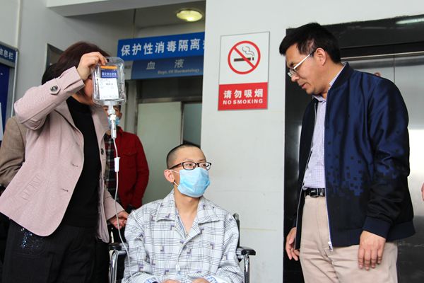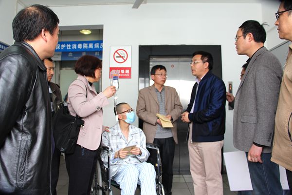 在保護性消毒隔離病區,謝謙云代表王勁松局長、鄒施凱校長向馬帥及其父母進行了深切慰問。他表示,局領導和全校師生對馬帥不幸罹患白血病,十分關切,非常惦記,高度重視。組織上會盡最大的努力為你們排憂解難,你們不要有任何顧慮,對生命要充滿堅強的信心,積極配合救治,哪怕只有1%的希望,也要做出100%的努力。當得知馬帥同學在救治間隙還不忘溫習功課,謝謙云再三叮囑他不畏病魔,安心養病,爭取早日重返校園!