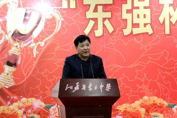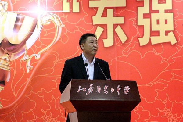 市教育局局長、黨委書記王勁松在講話中指出,我市2017年小高考的全線飆紅,為上半年的考試季打響了第一炮。對于本屆高二,市局、學校和全社會都充滿了期待。今天的頒獎雖然不能人人獲獎、個個登臺,但它猶如點燃了一團火焰,讓激情燃燒的歲月火花四濺,亦如打開一畝方塘,營造出高二學子百舸爭流、千帆進發的青春勵志風景,我們有理由對今秋和來年的高考更加充滿期待和遐想!他希望東中圍繞高二年級“強管理、謀進取、激發新活力”的目標定位,及時提煉經驗,發揚成績,將小高考的輝煌和小高考精神變為繼續前進的動力,適應高考錄取新走向,積極推進資源建設,對接名校自主招生,建好用好項目平臺,打造人才質量高度,為更多同學脫穎而出,圓夢名校創造條件,夯實基礎。希望同學們走進學習的夏天,在博學中,博觀約取、厚積薄發;在審問中,建構知識、追尋意義;在慎思中,獨立自主、舉一反三;在明辨中,去偽存真、去粗取精;在獨行中,步履堅實,行穩致遠。不斷拓展,用好各類活動的試金石,拿到更多的名校入場券,在求知成長的路上不斷遇見更好的自己,為學校、父母也為自己爭光添彩;希望廣大家長一如既往關心和支持東中的發展,共同護佑教育生態,提升教育質態,打造東中優質的教育品牌,堅信東中的明天一定更加美好!