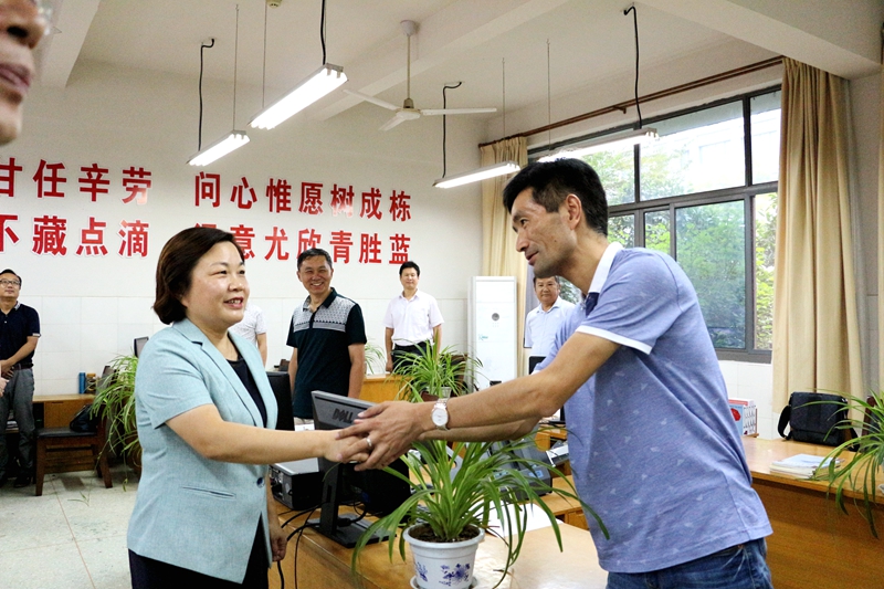 在高三年級班主任辦公室,陳衛(wèi)紅滿面春風(fēng)。她與老師們一邊握手,一邊詢問任教情況,同時向鄒施凱校長了解了高三目前的規(guī)模、師資配備和運轉(zhuǎn)狀況。