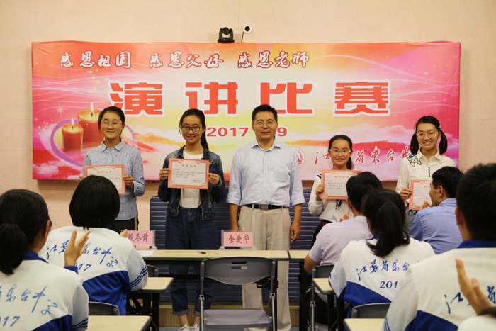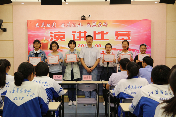 政教處主任余愛華宣布了比賽結果,副校長謝謙云為獲獎選手頒獎并同獲獎選手合影留念。