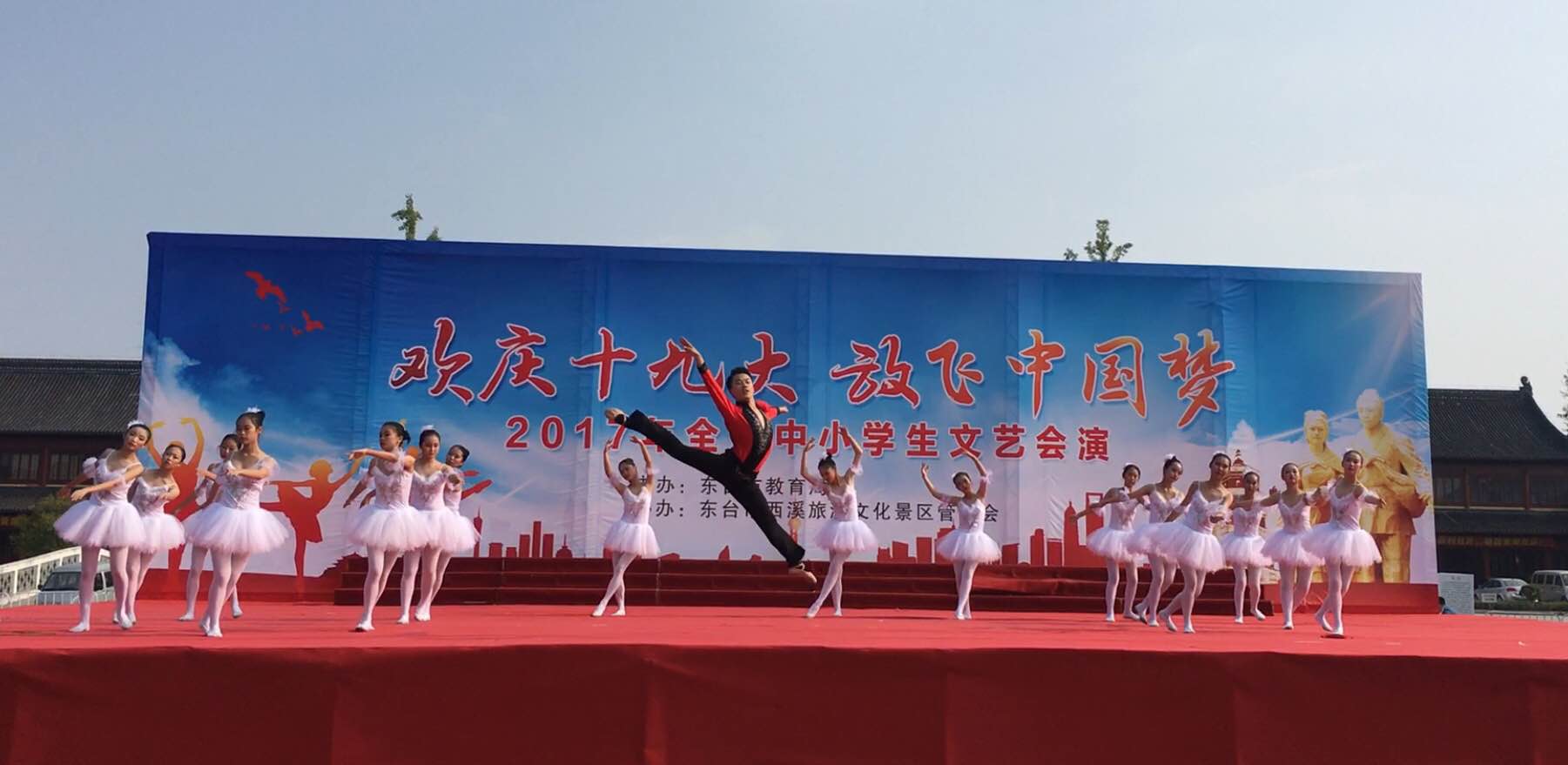 10月22日上午東臺市教育局在西溪旅游文化景區成功舉辦了2017年全市中小學文藝匯演活動,本次活動的主題是歡慶十九大 放飛中國夢 ,全市多所中小學參與了匯報演出。我校高一年級高文潔、郎晨、黃璐等同學在王曉蘭老師的組織下,利用課外時間,精心準備,在此次活動中以群舞《春天的芭蕾》博得了觀眾陣陣掌聲,取得了良好的社會贊譽,再次對外展示了文化東中的良好形象。