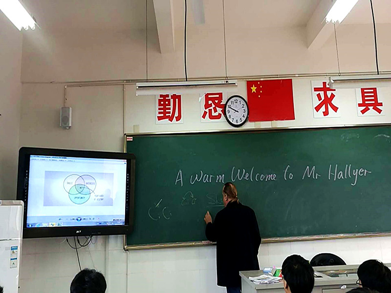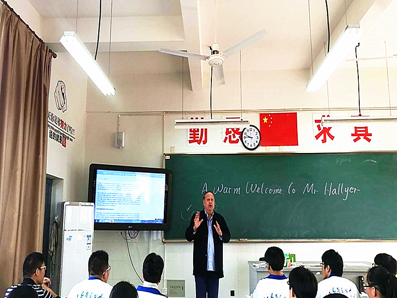 在熱烈的掌聲中,金發(fā)碧眼的Hallyer老師面帶微笑走上講臺。隨意的外表、親切的話語一下子就拉近了與同學(xué)們的距離。外教老師和同學(xué)們一起暢談“中國高考”,探討美好的未來。Hallyer老師手舞足蹈,聲情并茂,引起臺下陣陣笑聲。Hallyer老師深入淺出地分析夢想的可行性,職業(yè)的可選擇性,計劃的變通性,將英語教學(xué)融合在現(xiàn)實的交談中,對學(xué)生進行潛移默化的教育。