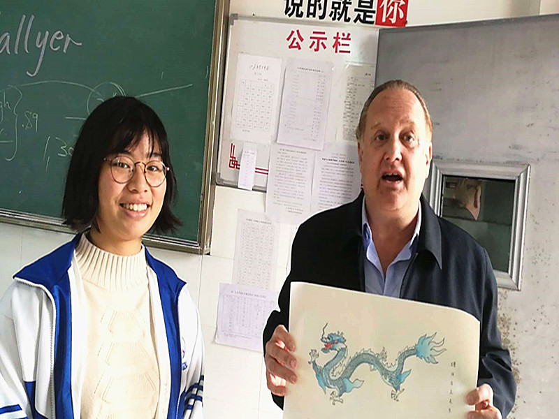 Hallyer老師離別之時,朱賁倩同學(xué)向他贈送了一副“中國龍”的繪畫作品,寓意著外教老師的中文名白龍。Hallyer老師連豎大拇指稱贊中國學(xué)生,稱贊中國夢!Hallyer老師的到來讓同學(xué)們獲得真實的口語歷練,提升了英語學(xué)習的濃厚興趣,將英語學(xué)習推向新一輪高潮。