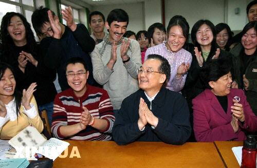 2月3日至4日,中共中央政治局常委、國務院總理溫家寶先后到吉林省長春市、松原市的企業、農村、醫院、學校考察。這是2月4日,溫家寶總理來到長春東北師范大學圖書館,和正在看書的學生交談。當聽到總理說國家將加大對師范院校的改革和扶持力度時,學生們熱烈鼓掌。 新華社記者劉衛兵攝