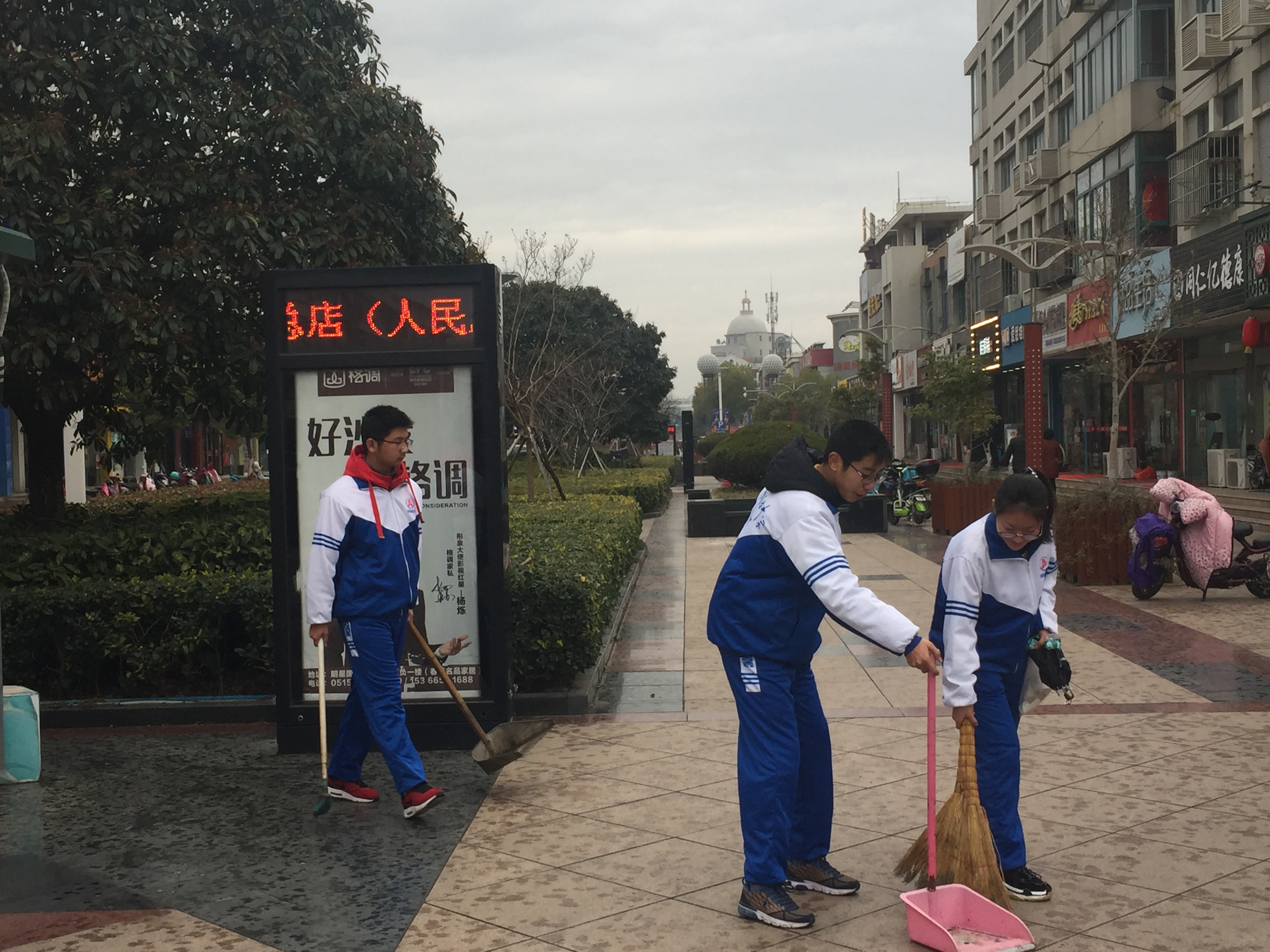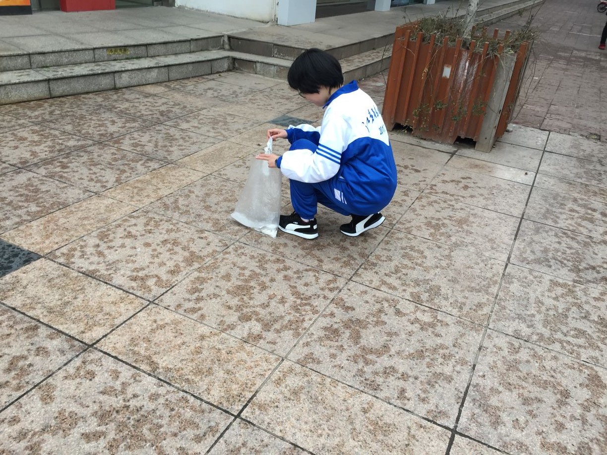 身著校服的高一9班同學,拿著掃帚,緩步走在街上,將路面上的廢紙、果殼輕輕掃入垃圾箱。因為潮濕,有些紙屑很難掃去,心安理得的躺在路面上。高一9班同學不禁皺皺眉,俯下身,將這些小頑固送進垃圾袋。一路走過,回首發現,街道變得更加明亮整潔,高一9班同學的心也輕快起來。