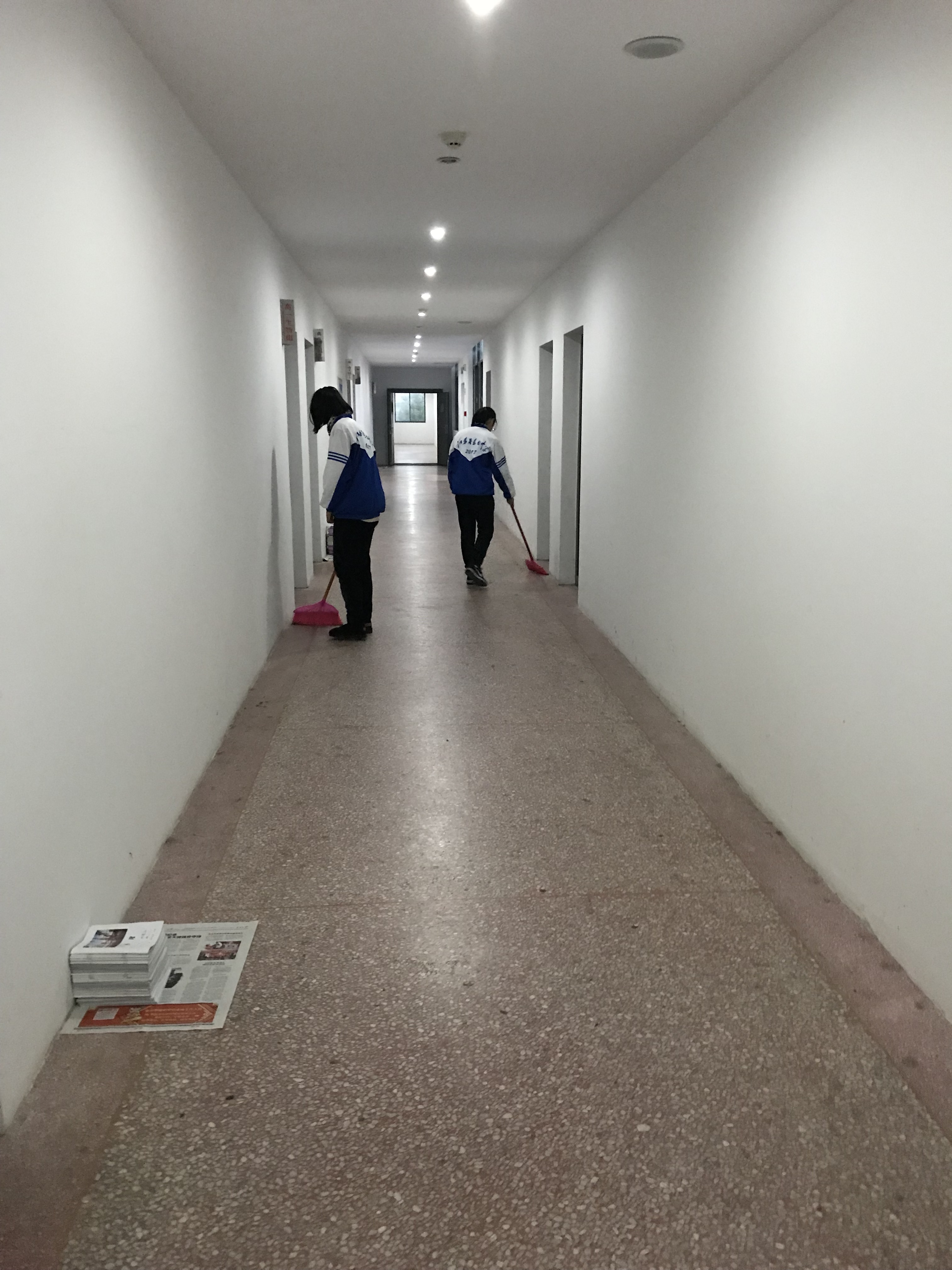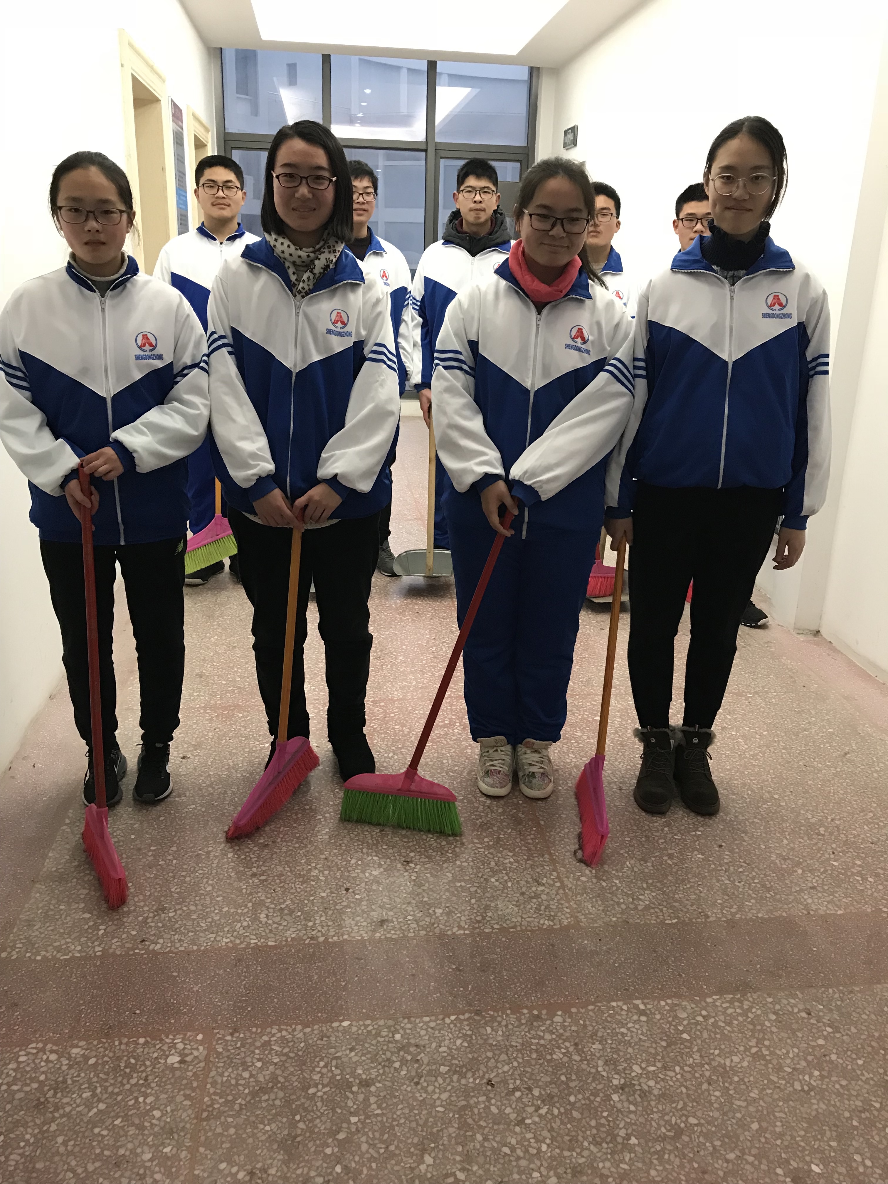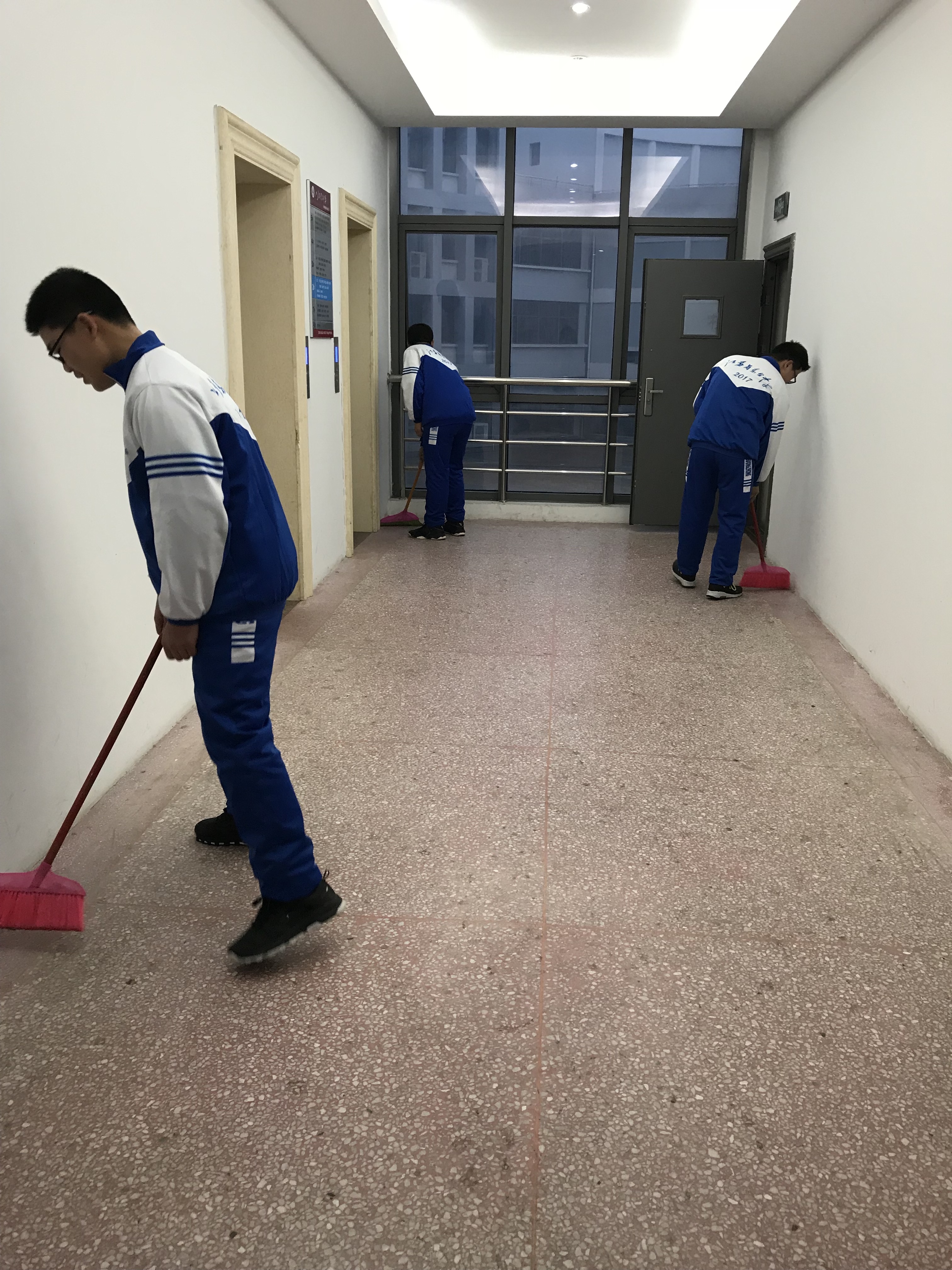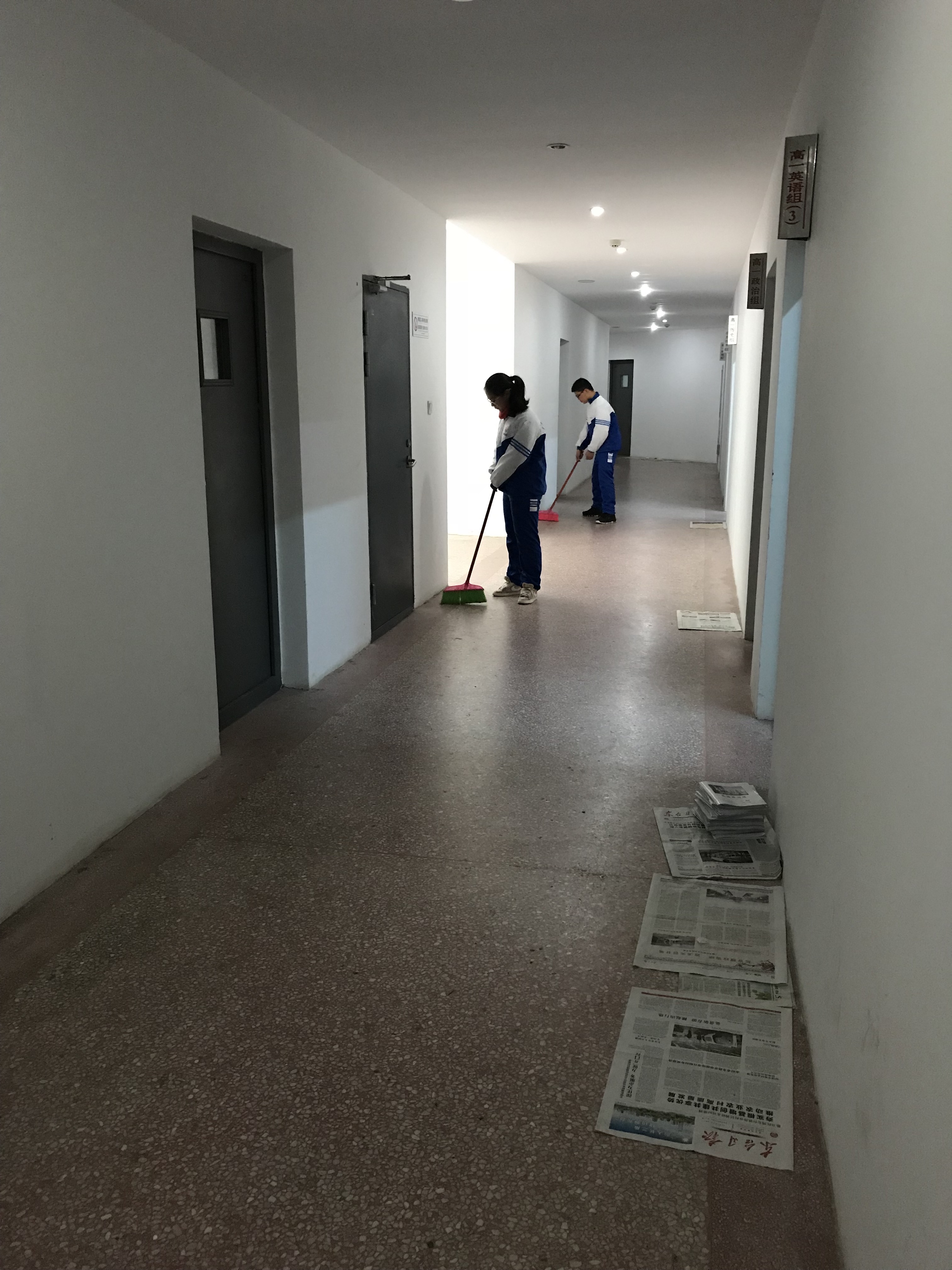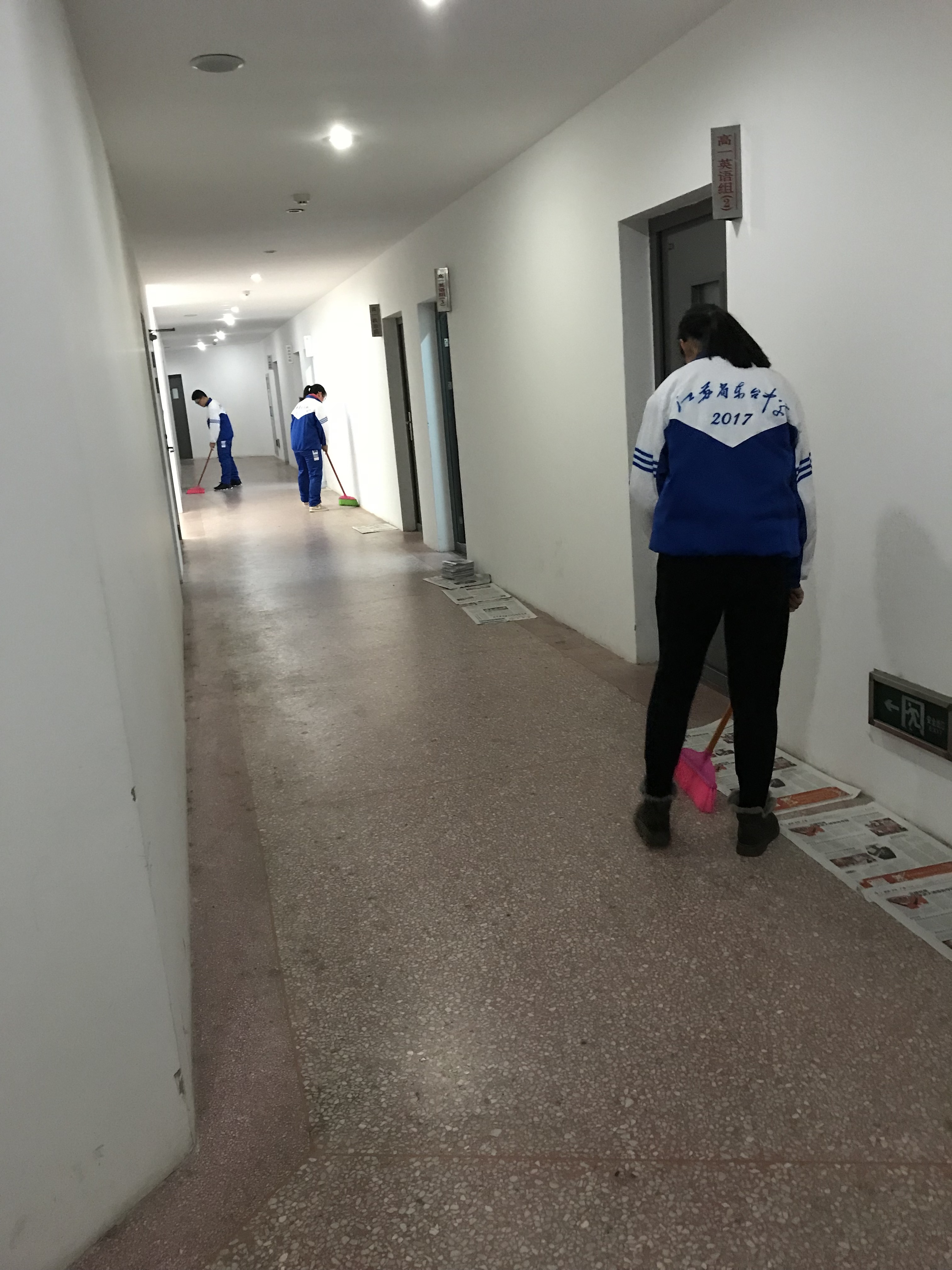 通過前期在班級的積極宣傳,在主要幾個班干部的積極主動帶領下,有9名學生報名參加,由于一些外在條件的制約,通過協商,決定以綜合辦公樓二樓為服務地點。活動共9人,分成兩組,對整個二樓包括電梯處和樓道處的衛生進行打掃,包括撿起走廊上的廢紙,各個辦公室門口地上放學生作業的報紙進行整理,用拖把將走廊打掃干凈等等,整個活動進行的井然有序。