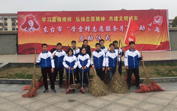 學校政教處、團委和工會組織的學雷鋒志愿服務行動是此次系列活動的重頭戲。2018年3月4日,高一年級18個班級近1000名學生走出校園,開展了形式多樣的志愿服務活動。在城東新區的公交站臺旁,同學們抹去了候車座椅上的灰塵;在東臺市老年公寓,同學們為孤寡老人們表演節目,整理內務;在東臺人民公園,志愿者們向游人宣傳環保理念;在東臺市文化廣場上,同學們撿拾垃圾,打掃衛生;在人流密集的街頭,同學們為鹽城市東臺福利院的孩子們募集善款,并送去慰問品;在東臺市火車站,志愿者們為有困難的旅客搬運行李;在鼓樓步行街、城東新區廣場、德潤廣場超市……處處留下了東中學子忙碌的身影,校服的藍白與志愿服務馬甲的鮮紅融合成了春天里最美的色彩,同學們用辛勤的汗水和文明的良好形象贏得了廣大市民群眾的高度好評。