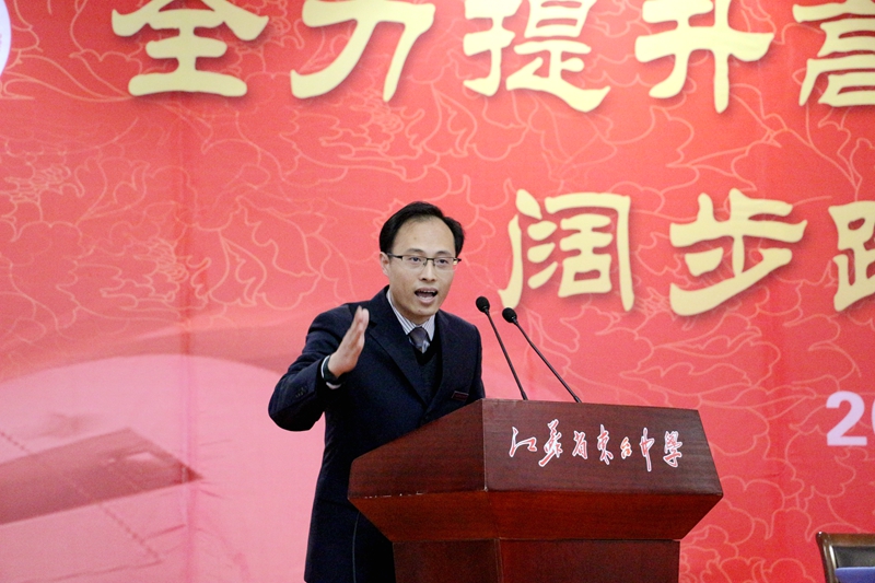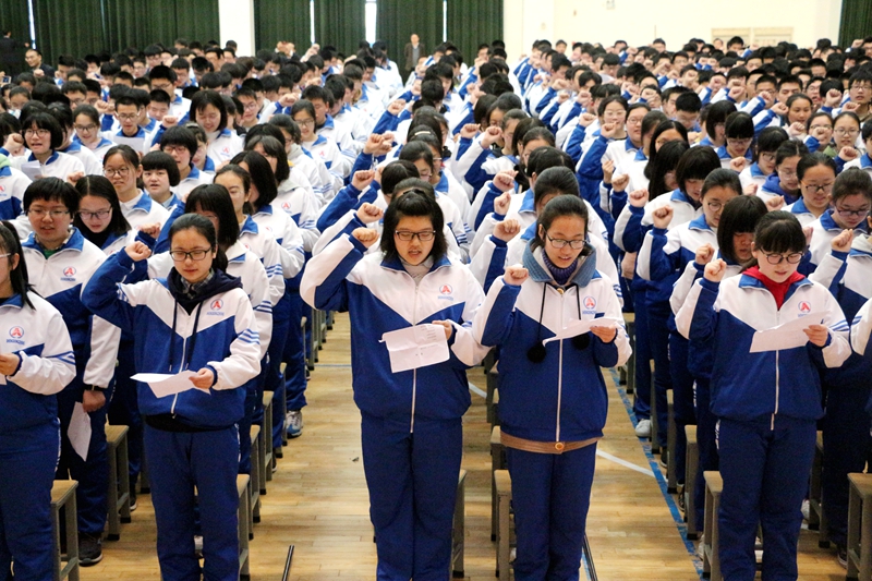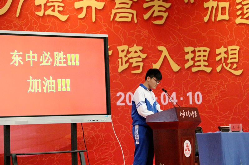 教師代表丁周衛和學生代表陳佐先后發言。丁周衛以其首字母“dzw”笑寓“東中旺”,傳遞出強烈而積極的心理暗示。幽默的話語靈動了全場。他表示:我們愿做綠葉,陪襯你們的理想之花盡情綻放;我們愿為渡船,承載你們到達理想彼岸;我們愿化雄風,托起你們自由翱翔的翅膀!并高呼,狹路相逢勇者勝!勇士們,亮劍吧!亮出你們的氣勢,亮出你們的膽略,亮出青春無畏的精神!同學們,挺起你的胸膛,握緊你的右手,跟我一起高呼:東中必勝!必勝!必勝!