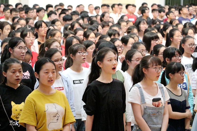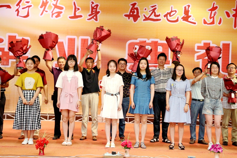 一束鮮花解萬語,一曲歌舞寄深情。典禮上,學生代表向18位班主任獻上了多彩的康乃馨,感謝師長三年來與全體同學的朝夕相伴、精心呵護和人生指點。一群能歌善舞的同學特意獻演了歌舞《長大后,我就成了你》,表達即將離開母校,不負擔當、勵志向上的高遠志向。各班代表合演的大合唱《夢想天空分外藍》登場了,同學們的耳邊,仿佛又回蕩起“勤能煮海,進可登天”的東中精神,腦海中又聳立起勵志塔、煮海鼎的英姿,演化出波光粼粼的攬月湖——現(xiàn)場再次掀起高潮。