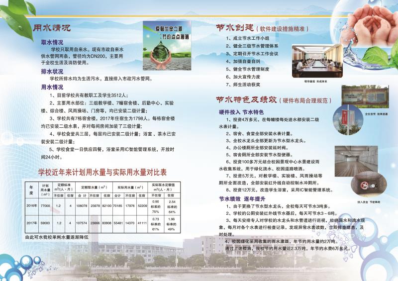 用特色教育去擠。創建工作中,學校多次開展“創建節水型城市,實施可持續發展”主題教育活動,在師生中舉辦“節水全民行動,共建生態家園”系列演講,化學組結合校本課程建設,在研究性學習活動的基礎上,出版專著《水是生命之源》。有力促進師生節水創建的知行合一。