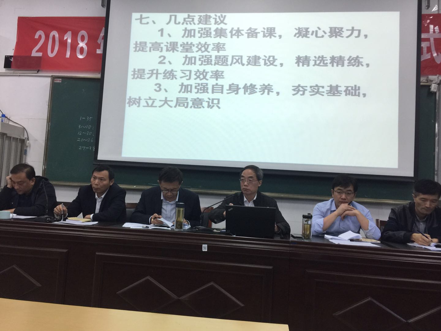 金松濤主任首先通報(bào)了階段性考試的數(shù)據(jù),并在此基礎(chǔ)上進(jìn)行了詳細(xì)的分析,通過對比組合內(nèi)語數(shù)外學(xué)科均分、選修學(xué)科均分、班級均分等方面,指出存在的問題,并通過與上一次階段性考試的對比,表揚(yáng)了先進(jìn)和有進(jìn)步的老師。通過學(xué)生調(diào)查問卷對本次考試的命題質(zhì)量給予了肯定,對作業(yè)的質(zhì)、量及批改等方面存在的問題進(jìn)行了點(diǎn)擊,同時提出三點(diǎn)建議:一、加強(qiáng)集體備課,凝心聚力,提高課堂效率。二、加強(qiáng)題風(fēng)建設(shè),精選精練,提高練習(xí)效率。三、加強(qiáng)自身修養(yǎng),夯實(shí)基礎(chǔ),樹立大局意識。