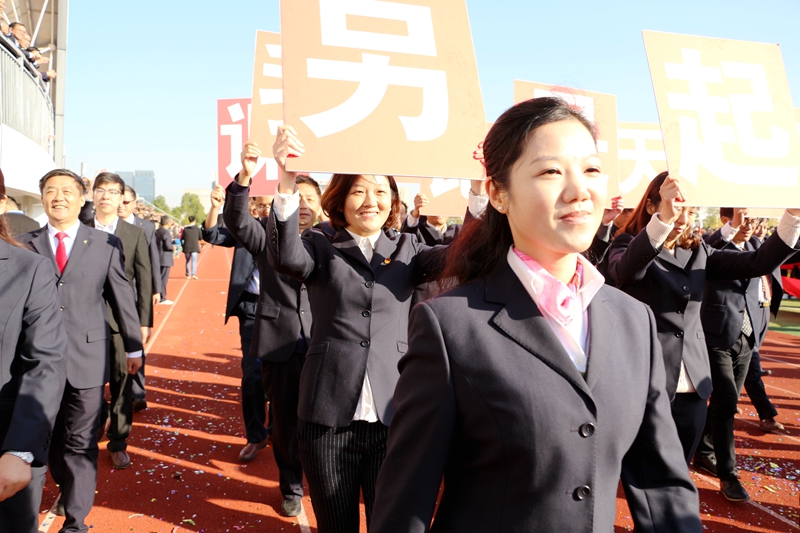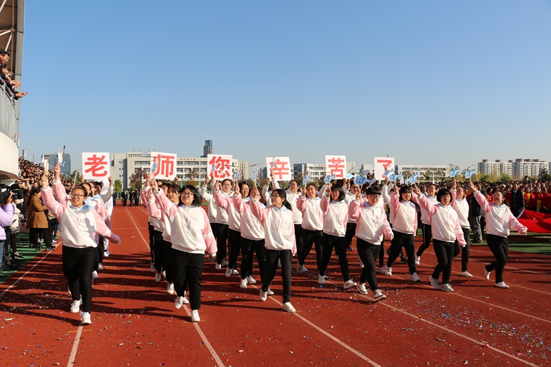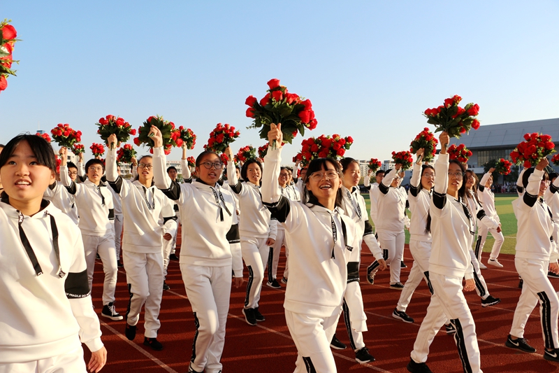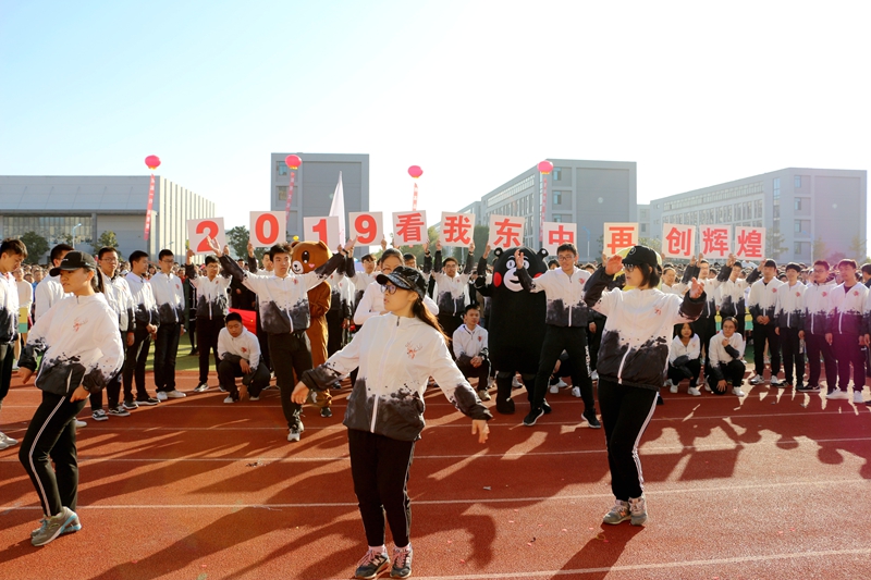 辛勤的汗水是他們無私的奉獻,桃李芬芳是他們最高的榮譽。由36人組成的教師方陣,最后驚艷出場。全場矚目下,他們步伐矯健、意氣風發、挺拔清朗,高高舉起“另起一行,我是第一”辦學理念、“勤能煮海,進可登天”的鏗鏘校訓。自信東中、東中自信的氣場在同學們的歡呼中,瞬間彌散校園上空……