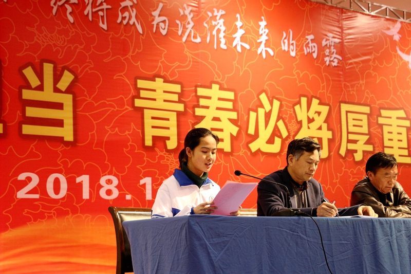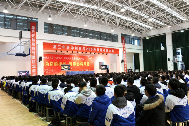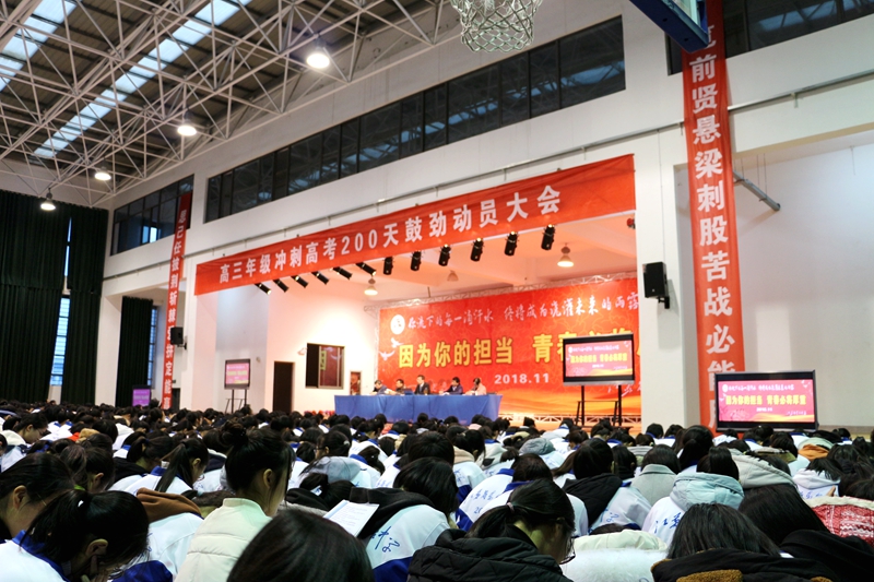 本次大會可謂匠心獨(dú)運(yùn)。現(xiàn)場四個(gè)大屏首先播放了原山西運(yùn)城市委副書記、中國作家協(xié)會會員安永全先生《我的高考》專題片,30分鐘人生起轉(zhuǎn)的不堪回眸,令1000多名學(xué)子倍感震驚。主席臺兩側(cè)高懸的“覽先賢懸梁刺股苦戰(zhàn)必能勝,思己任披荊斬棘愛拼定能贏”巨幅,承古策今,畫龍點(diǎn)睛。由此,向高三學(xué)子傳遞出這樣強(qiáng)烈的信念:你流下的每一滴汗水,終將成為澆灌未來的雨露!
