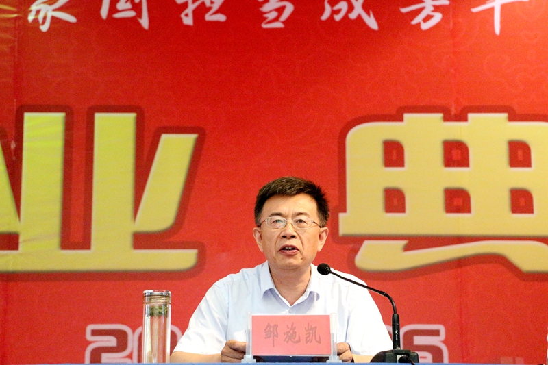 畢業典禮上,校長、黨委書記鄒施凱作主題為《丹青難繪是精神,家國擔當鑄芳華》的精彩致辭。他以感恩過往、憧憬未來、迎接挑戰、勿忘家鄉等四個“一千”的動情表達,寄語同學們果勇擔當,堅毅遠航。