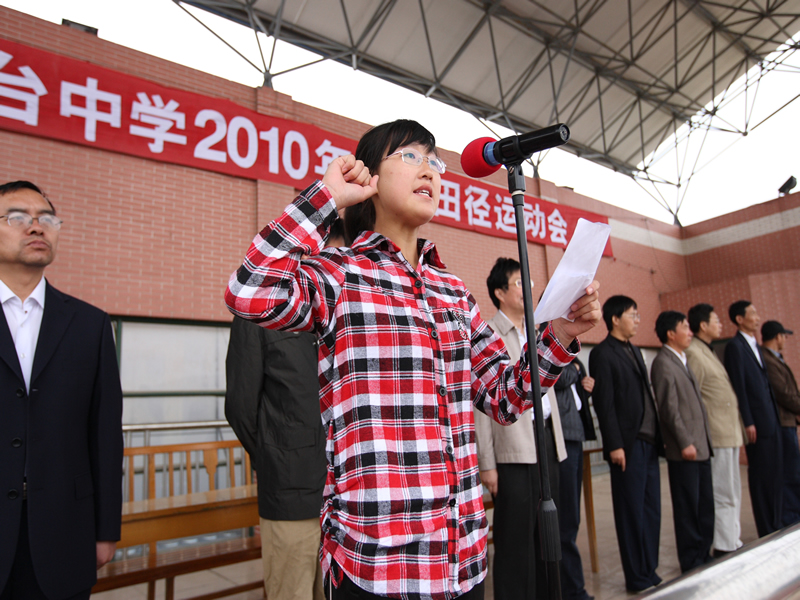 在體育教師吳志祥、高二(21)班學(xué)生王雪倩分別帶領(lǐng)裁判員、運動員宣誓后,比賽正式開始。